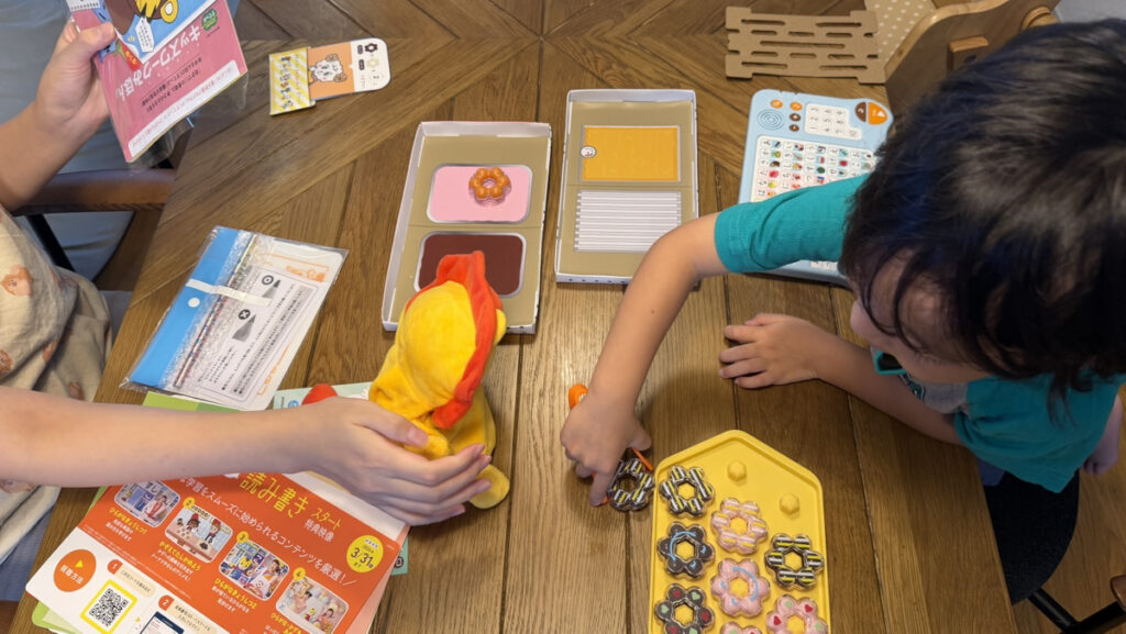 ドーナッツ屋さんごっこなどの「ごっこ遊び」も楽しいようで、一生懸命ドーナッツの数を数えながらしまじろうやみみりんたちにドーナッツを用意してくれています。