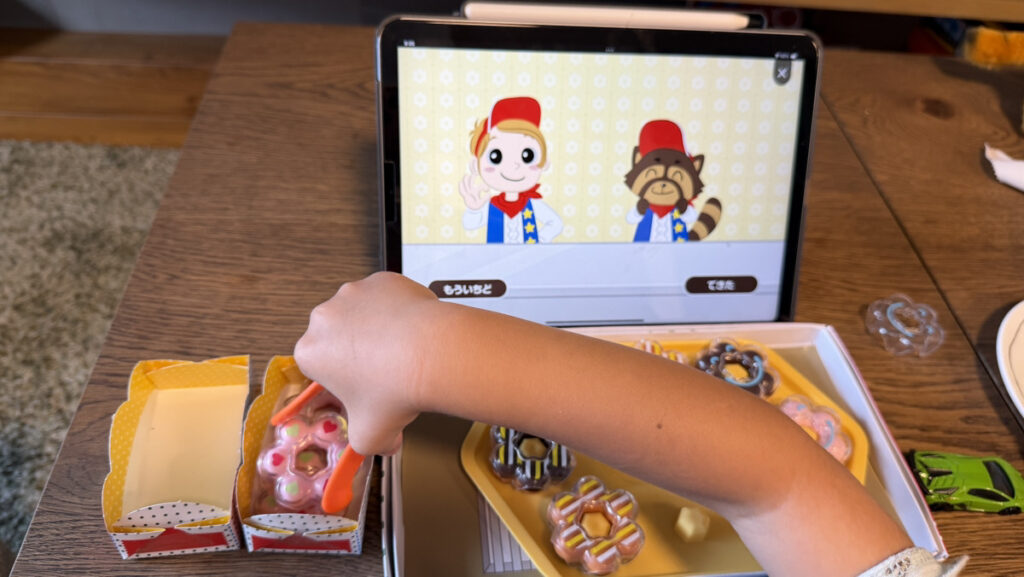 ドーナツ屋さんごっこ用のエデュトイが気に入ったようで、息子もすぐに遊び始めてくれて食いつきは抜群です。