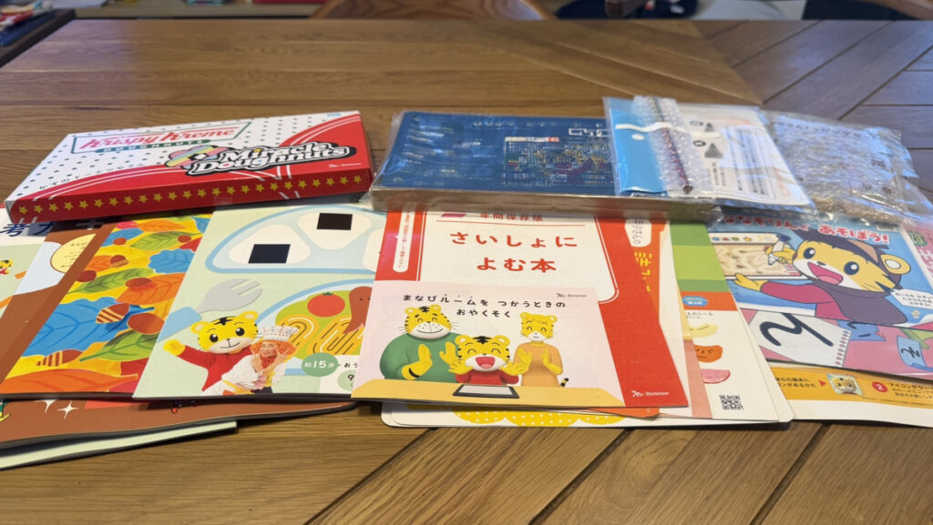 こどもちゃれんじに申込んでから2~3日後、こんな感じでたくさん紙のワークやエデュトイとよばれる知育おもちゃが届きます。