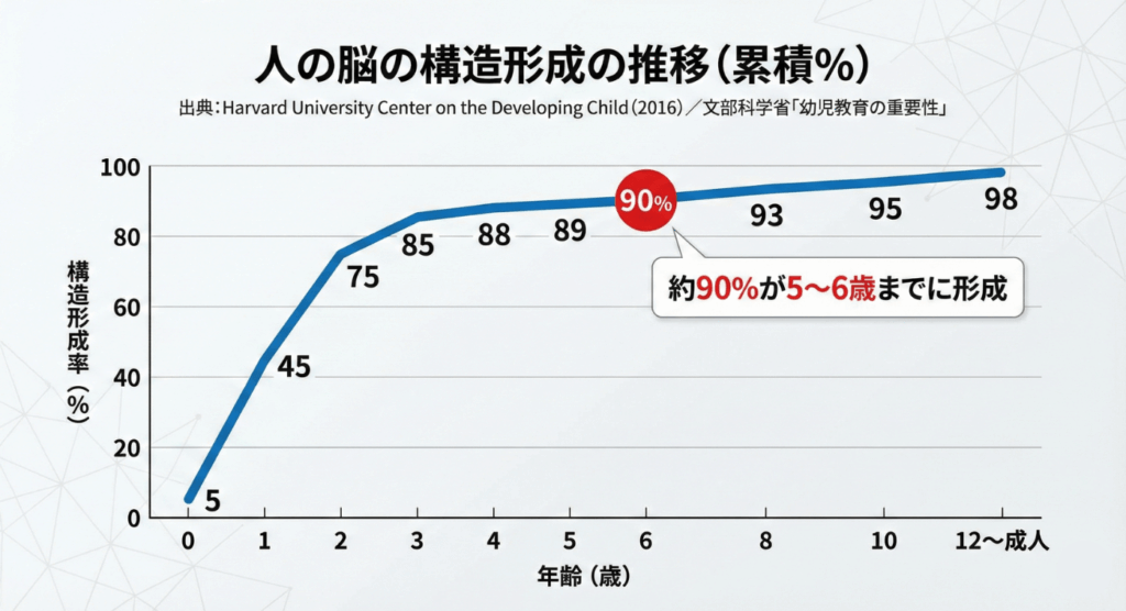 ハーバード大学の研究によると、人の脳の構造の約90%が5~6歳までに形成されるとされています。